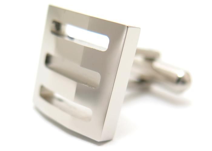 側面から見るとD型に成型された土台を使い、中央に3つのラインを有し、上下は空洞、中央は艶消しされたシンプルデザインカフリンクス。