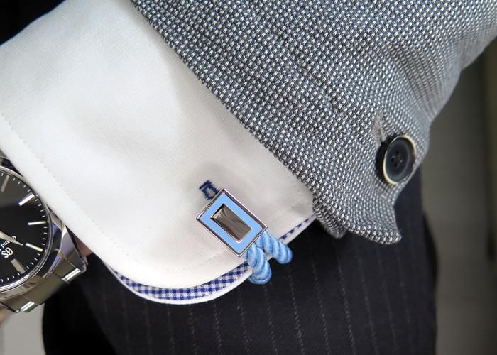 光沢のある日本製シルクロープで袖を包む形のカフリンクス。フェイス部分はロープと同系色のエナメルを使いアクセントに。バベットワッサーマン定番のエレガントカフス。