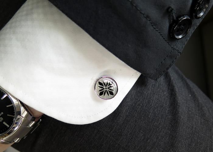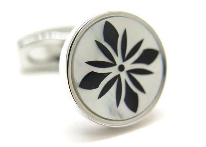 手作業で磨き上げた白蝶貝の上に、デジタル・スクリーン印刷で花びらをデザインしています。洗練されたデザインでありながら、多用途にお使いいただけるカフリンクス。