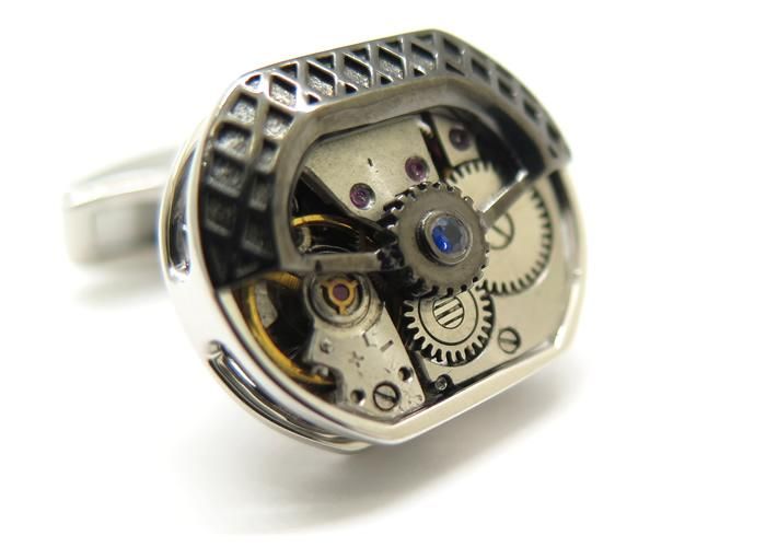 人気のトノー スケルトン カフリンクスは、光沢のあるロジウムとブラックロジウムコーティングのスターリングシルバー製。カフリンクスの縁を囲む3Dダイヤモンドパターンと、中央にサファイア(0.03カラット)を埋め込んだブラックロジウムコーティングの歯車が特徴的なこの長方形のカフリンクスは、比類ないラグジュアリー感を放ちます。裏蓋にはカットアウトされたダイヤモンドの窓パターンがエレガントに施され、その下にあるユニークなムーブメントを見ることができます。