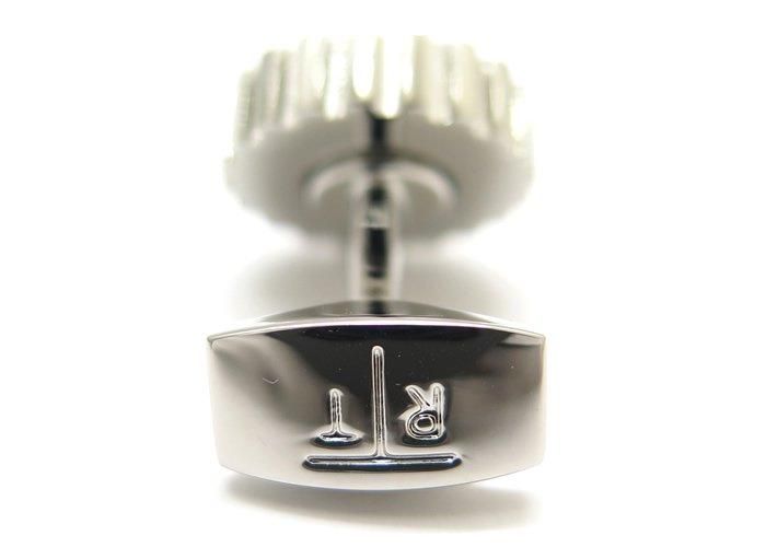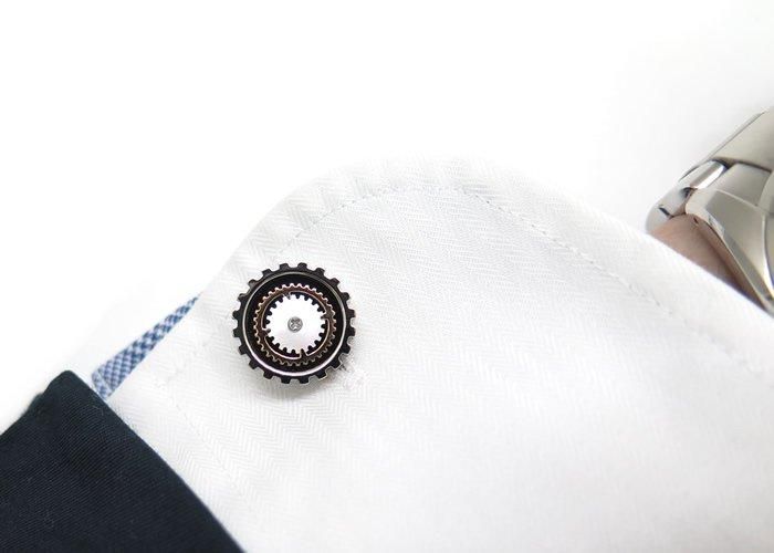 クラシックなエレガンスとモダンな汎用性を融合させたダブルエンドのギアデザイン。ポリッシュ仕上げのパラジウムとローズゴールドの地金から精巧に作られたカフリンクスには、ブラックとホワイトのコントラストが美しいマザー・オブ・パールがはめ込まれ、洗練された雰囲気を醸し出しています。フロントギアは回転するようにデザインされ、相互作用の要素を加えられています。