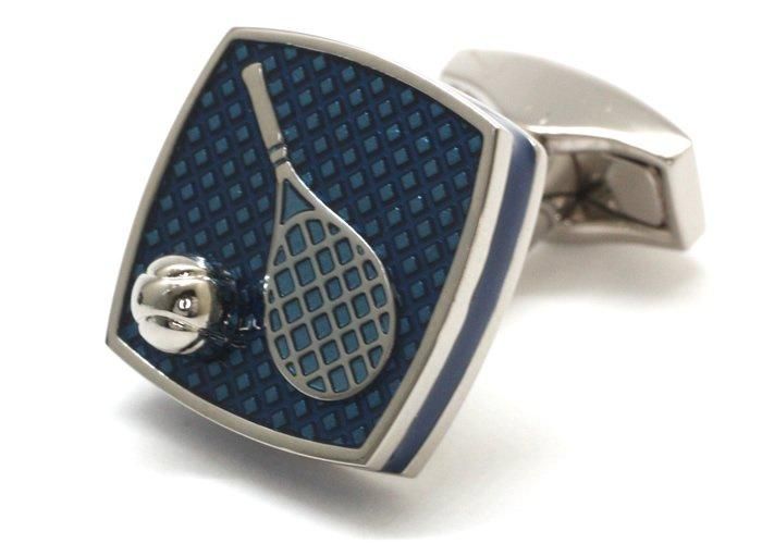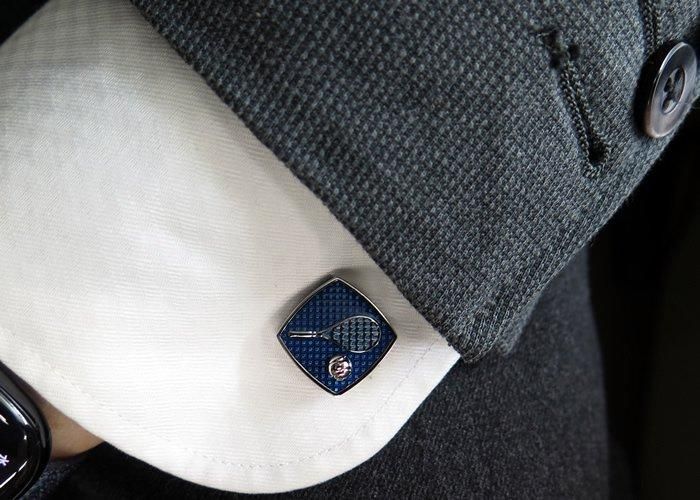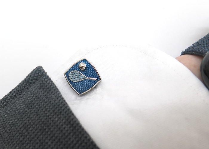 テニスのエネルギッシュな魅力をスタイリッシュに表現したカフリンクス。パラジウムプレートのベースに、繊細なブルーエナメル加工を施し、テニスラケットとボールのデザインを立体的に再現。グリッド状の背景が、コートの質感を思わせる洗練された仕上がりになっています。スポーティなエレガンスを求める方に最適なアクセサリーです。