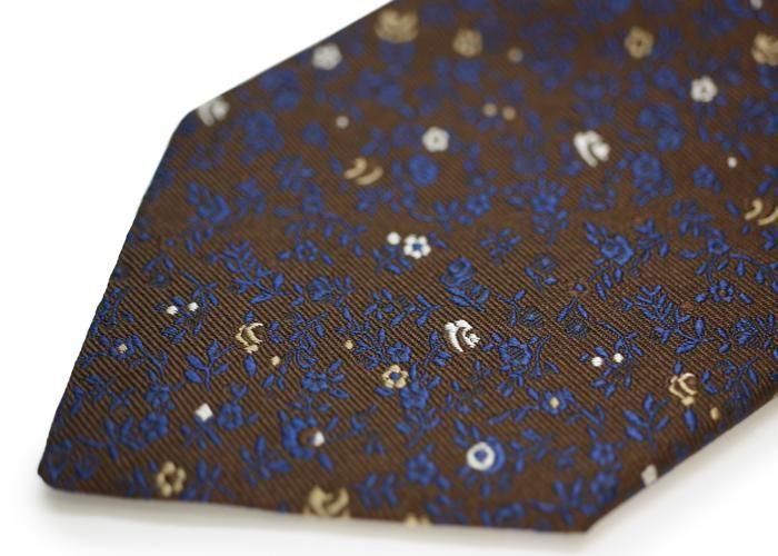 茶色地に補色の青のボタニカル柄が映えるこなれた色使いが印象的なネクタイ。差し色の花もバランス良く配置されシンプルでありながら首元のアクセントとして華やかに彩ります。