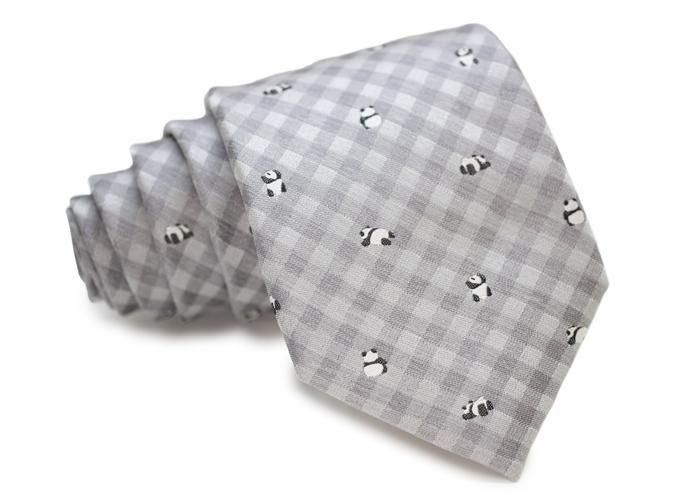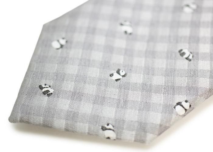 ギンガムチェックにパンダの可愛らしいイメージがマッチしたネクタイ。寝そべっていたり後ろ姿まで愛らしいコロンとしたフォルムがたまらないパンダの良さを存分に発揮したデザインです。