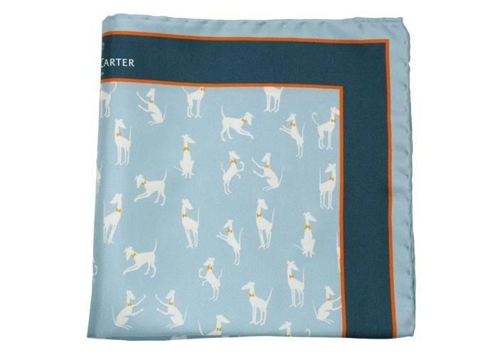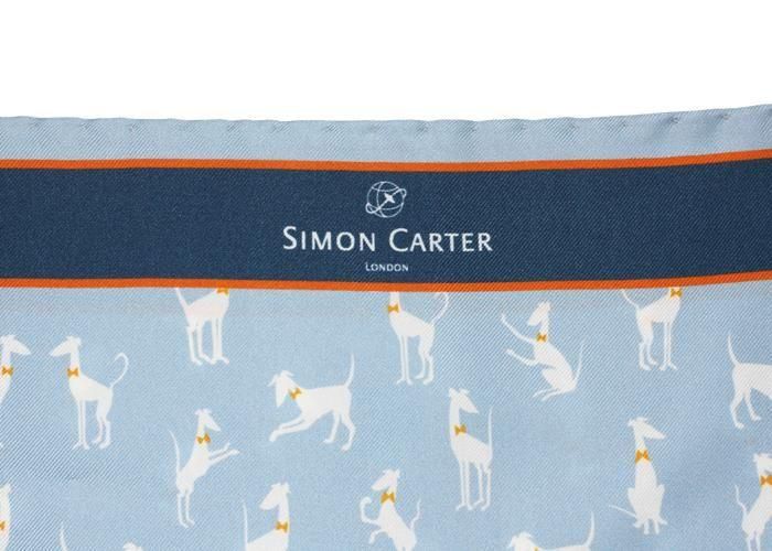 2025年に40周年を迎えたサイモンカーター。ブランドロゴの反対側にはアニバーサリーイヤーの「1985-2025」が記されています。サイモン氏のイマジナリーペットのジャーヴェイズがデザインされたポケットチーフは、イタリア製、シルク100%、ハンドロール仕上げ。