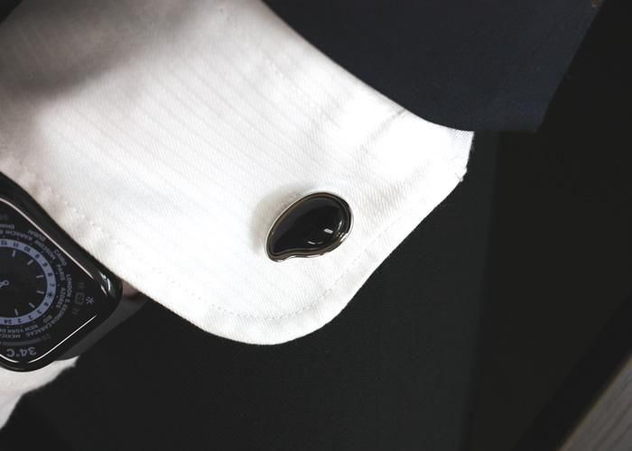 漆黒の輝きがシックな印象を与える天然石「オニキス」を、手のひらで転がしたような滑らかなペブル(小石)型に仕立てたカフリンクスです。磨き上げられたシルバーカラーの台座が、石の深みある黒を引き立て、ミニマルで力強い美しさを表現します。オニキスは古来より「意志の強さ」や「魔除け」の象徴とされ、集中力を高め、目標に向かう力を支えてくれるとされています。そのクールな佇まいは、ビジネスや式典などのシーンで、知的で洗練された印象を与えるでしょう。英国ブランドならではのデザイン性と、精神的な深みを持ち合わせた、現代のジェントルマンにふさわしいアクセサリーです。