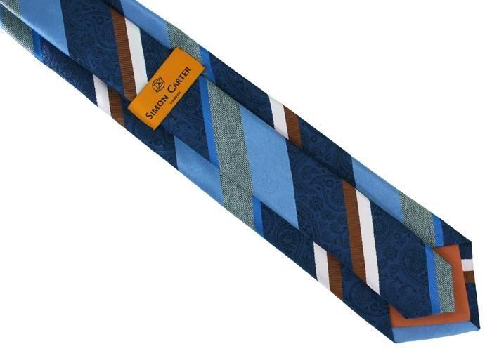 サイモンカーターらしいペイズリー柄に使いまわし抜群のストライプを合わせたネクタイ。暖色と寒色をバランス良く使いスタイリッシュに仕上がっています。
