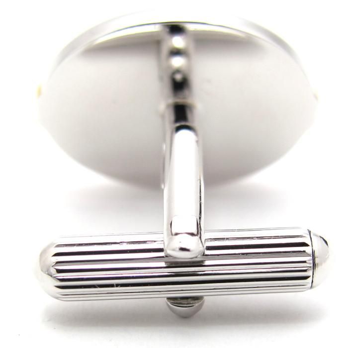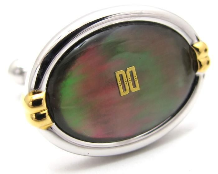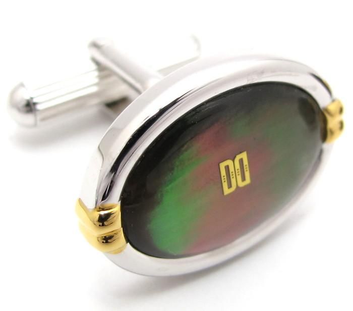 楕円形の夜光貝を使用したダックスのカフス。 夜光貝の深みのある輝きと中央に押された金色のダックスのロゴが高級感を醸し出しております。
